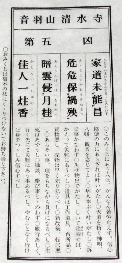 あ、このおみくじには「樹木に結ばないでください」と書いてありますが、清水にはちゃんと代わりにおみくじ結ぶ棒がありました。