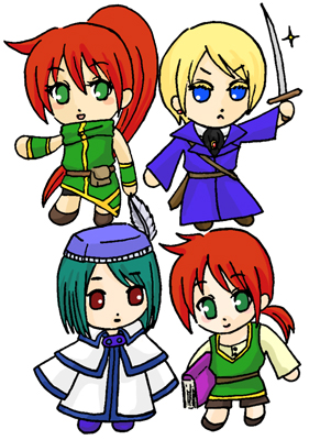 ↑の絵がそのキャラたち(仮)。ゲームでは使わないちびキャラ頭身らくがき。しかも自分でキャラデザしたのに間違えまくってる。
