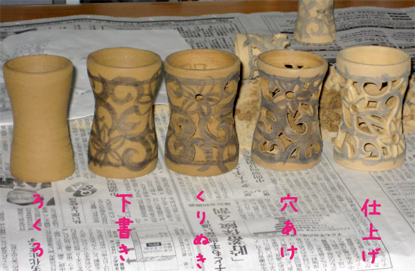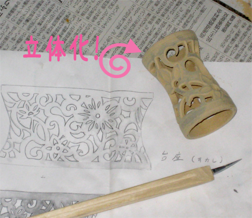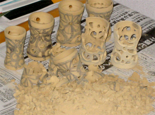 作り方はいたってシンプル、ろくろで筒状のものを作り、適当に乾かしてお手製のナイフでしょりしょり削るだけ☆