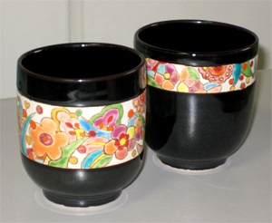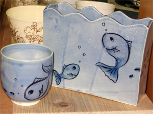 染付の絵+色つき釉薬重ね掛けの実験作品。蚊取り線香立ては友人に押し付けました。←